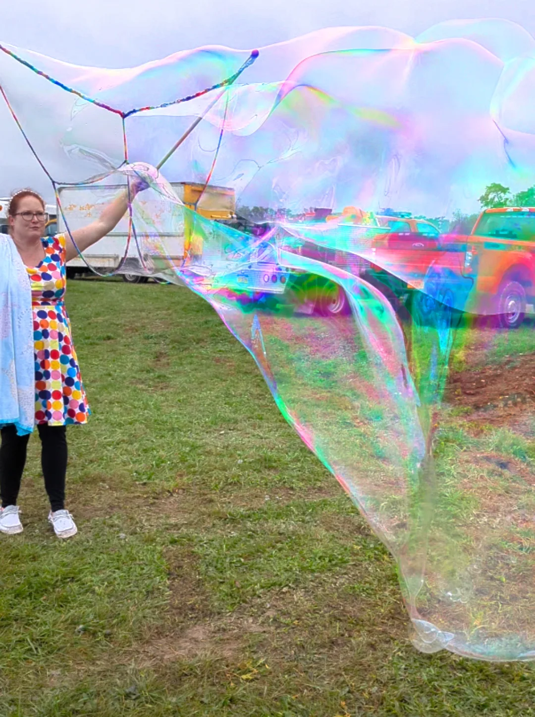 Our Butterfly String wand is designed for professionals! Hand-crocheted with acrylic yarn it’s as beautiful as it is functional. It produces large clusters of huge bubbles, and is great for breezy conditions where using a big tri-string would be a challenge.